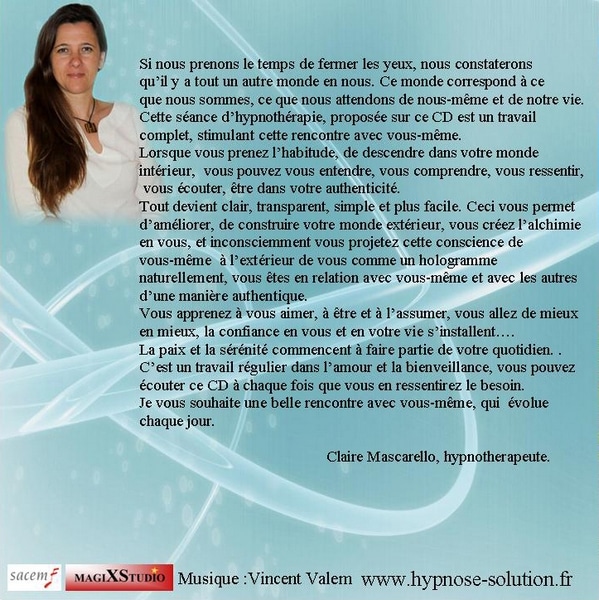 Installez-vous confortablement, au calme, avec des écouteurs, bien au chaud, et restez immobile. Cette immobilité est importante pour entrer naturellement dans l’état d’hypnose. La séance dure environ 38 minutes, mais votre perception du temps sera différente. Le son de ma voix vous permet de descendre en toute sérénité, et je vous accompagne du début jusqu’à la fin. Je vous guide comme un nouveau miroir, celui qui vous permet de rencontrer une nouvelle facette de vous-même. Pendant cette séance, je m’adresse à votre inconscient, pour lui transmettre des informations de travail, comme dans toutes mes séances : nous allons ranger, relier, remettre en place.